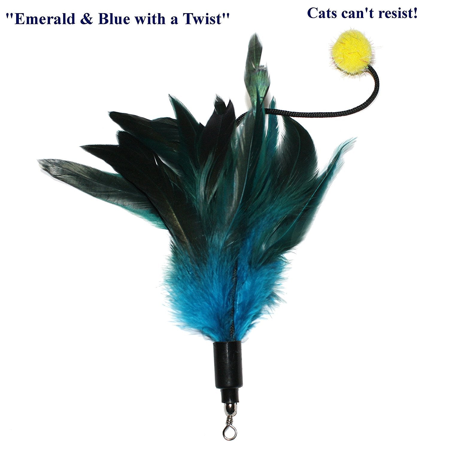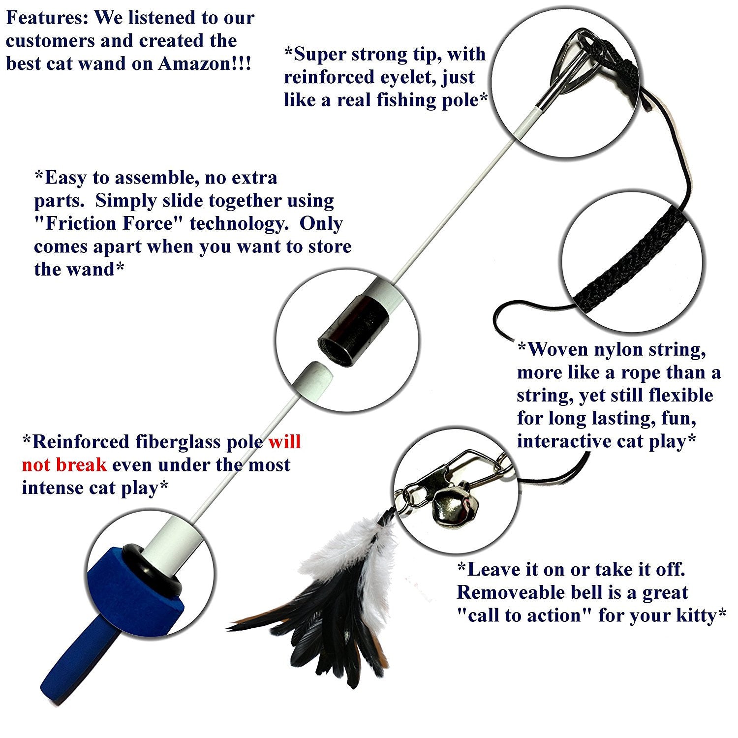 The 4 attachments that are included with this wand makes this a top pick for you and your cat. The 3 feathers provide different action as they fly through the air. Your cat will be flying with them as they stalk their prey and bounce just before you pull it away. The worm is a cat favorite. Many customers have asked us to make a package of just worms (coming soon!) because their cat cannot get enough of this cute little wiggler. Which one will your cat love best? Be sure to let us know! Our cat wand is: