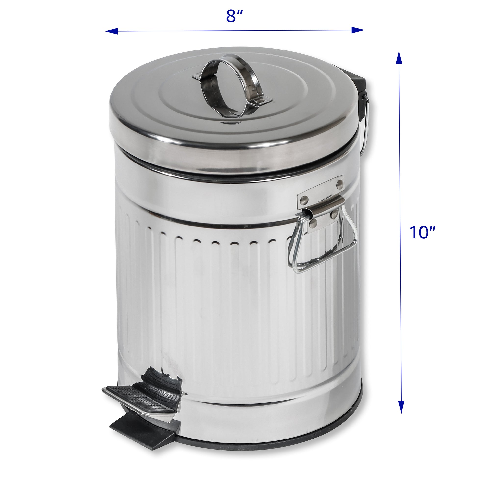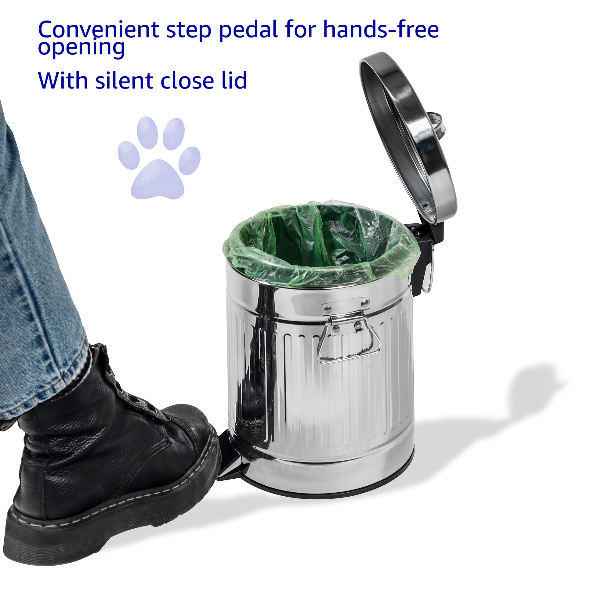 - The outside shell is made of a weather resistant galvanized steel designed to handle the elements so you can be confident this waste can is built to last. It also includes a foot pedal with a step-on/hands free lid opening mechanism to save your back from bending down all the time and help out when your hands are full.