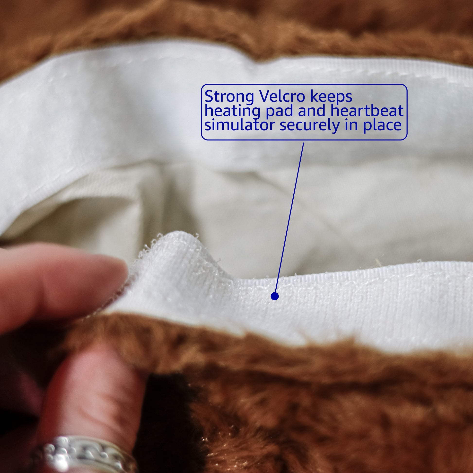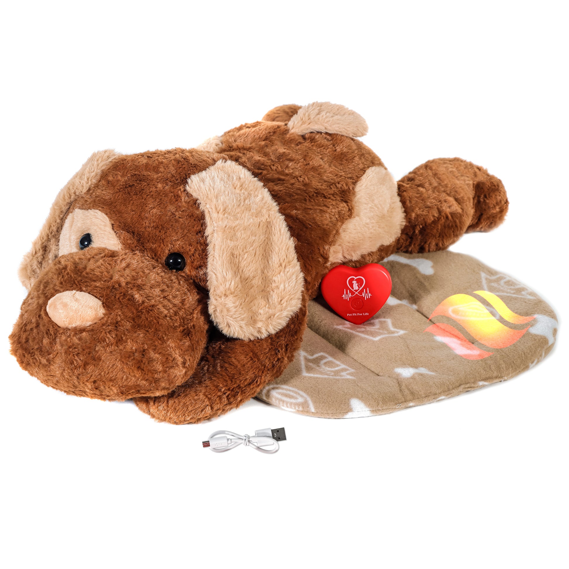 - This extra big heated puppy soother with heartbeat built in will mean a better night's sleep for your puppy and you! Provides a soft, fluffy, puppy heartbeat stuffed animal that feels warm and sounds like mom. Eases separation anxiety.