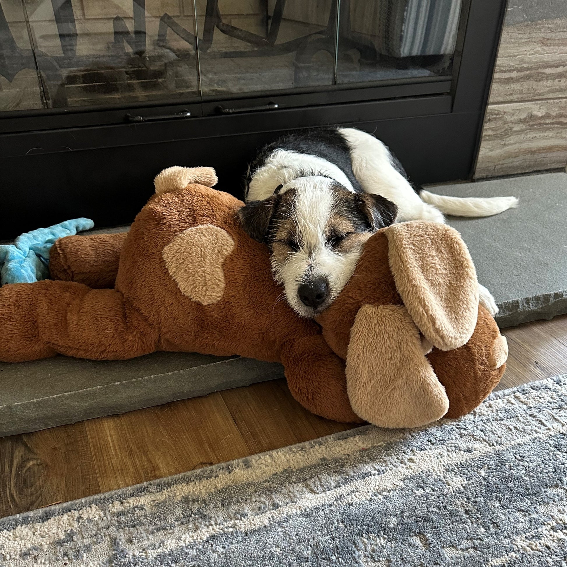 - We listened to our customers and added a microwavable bead heating pad to the belly of our extra large plush dog with rechargeable heartbeat simulator. We also added an auto-off setting to extend battery life so your pet's sleeping buddy will always be ready to provide soothing anxiety relief.