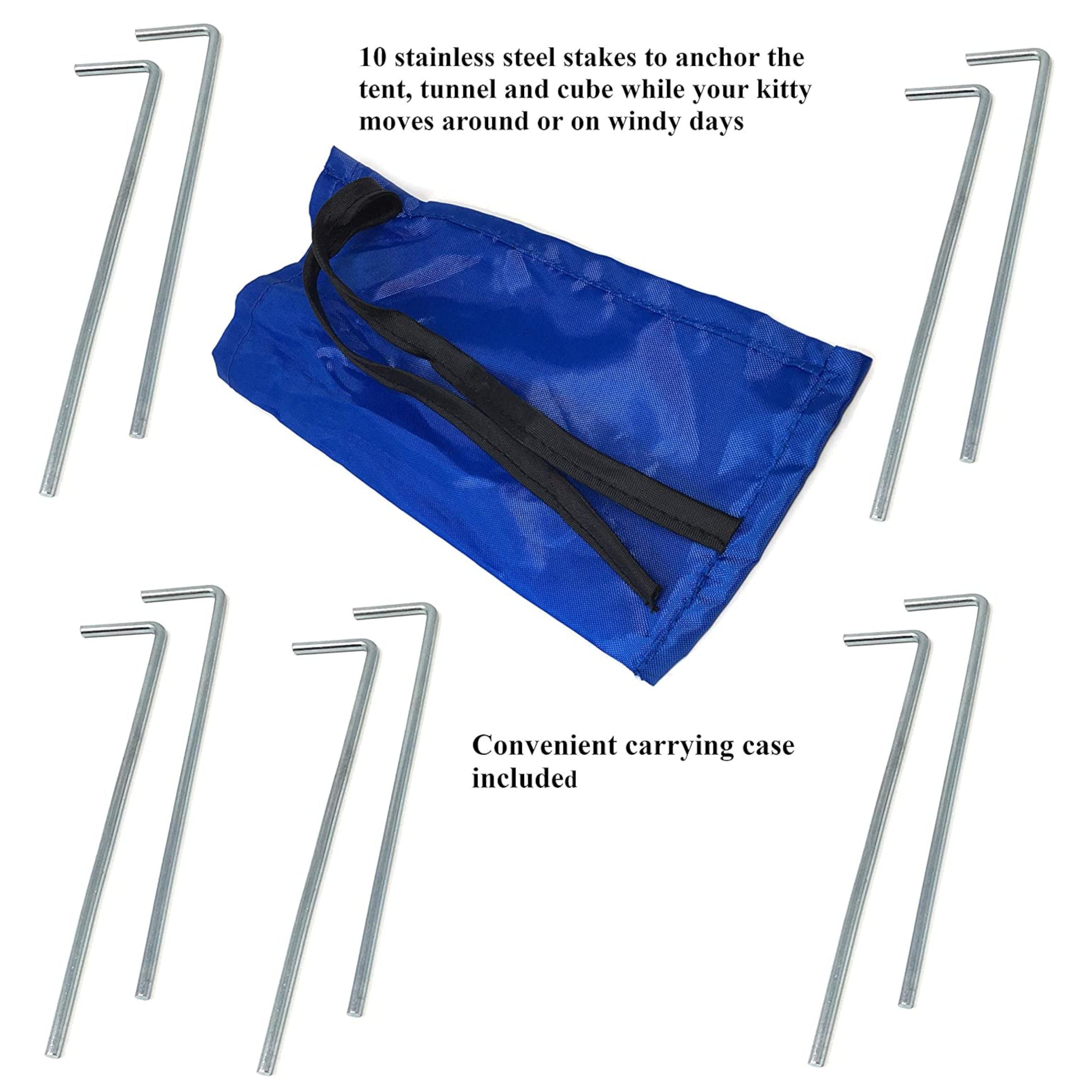 * Also included are 10 stainless steel stakes to anchor the tunnel and cube while your kitty or small animal move about or on those windy days.